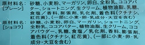 原材料:【プレーン】砂糖、小麦粉、マーガリン、卵白、ショートニング、全粉乳、ココアバター、生クリーム、植物油脂、乳糖、食塩、乳化剤(大豆由来)、香料、着色料(クチナシ、紅花黄)、膨張剤、ハッカ油 【ショコラ】砂糖、小麦粉、卵白、マーガリン、全粉乳、ココアバター、ショートニング、生クリーム、ココアパウダー、植物油脂、乳糖、食塩、乳化剤(大豆由来)、膨張剤、香料、着色料(クチナシ、紅花黄)、ハッカ油