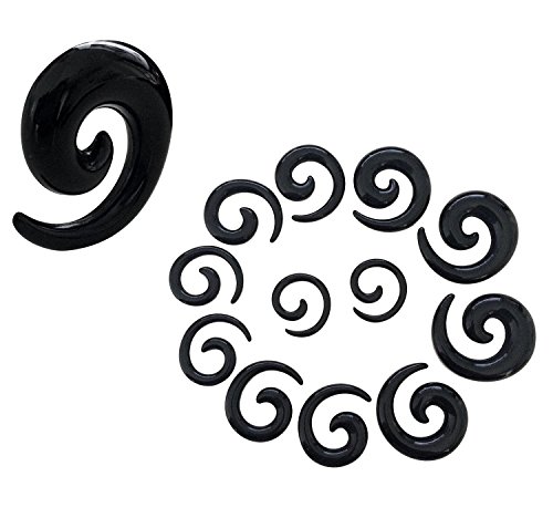 - Black Spiral Tapers = 14G (1.6mm) 12G (2mm), 10G (2.4mm), 8G (3.2mm), 6G (4mm), 4G (5mm), 2G (6mm), 0G (8mm), 00G (10mm) - 2 qty of each size