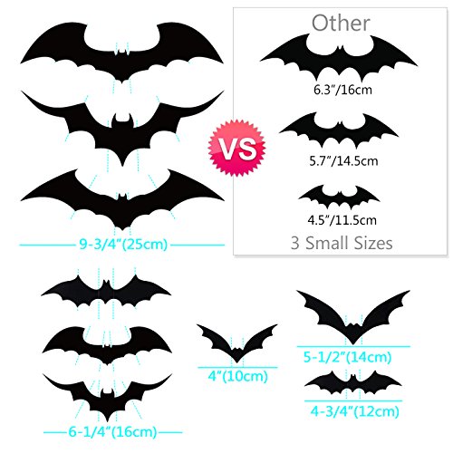 Updated version. 100 pcs LARGE 3D bats of thick PVC waterproof material. A box of bats of 5 MORE sizes & shapes. Better quality removable stickers. For indoor & outdoor.