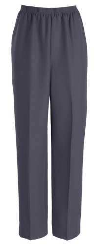 Alfred Dunner Pants are comfortable, everyday easy care pants with a pull-on style waist. Comfortable, pull-on pants Short length Full elastic waistband 2 side open pockets Permanent crease Easy care Machine washable Black/Navy/Grey/White: 100% polyester Brown: 89% polyester, 11% nylonFeature