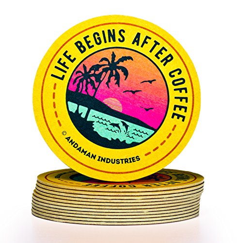 - Includes: 100 Disposable Paper Cups, 100 White Lids, 100 7" Stir Sticks, and 2 Original Artwork Coasters by Andaman.