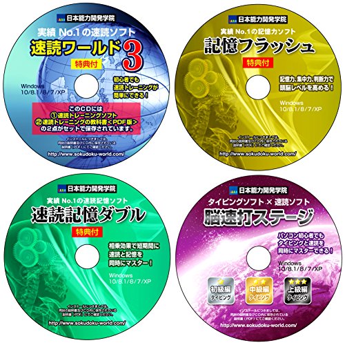 -. Feature : 【数量限定商品】【お買い得商品】大人気の「速読ワールド3の2点特別セット」/「記憶フラッシュ」/「速読記憶ダブル」/「脳速打ステージ」の4枚組セット商品です。「速読ワールド3の2点特別セット」、記憶力トレーニングソフト「記憶フラッシュ」、速読記憶力トレーニングソフト「速読記憶ダブル」、速読式タイピング練習ソフト「脳速打ステージ」を4枚とも購入されたい方に数量限定のスペシャル価格で販売しております。それぞれ1枚ずつご購入されるよりもお得にご購入いただけます。 / お子様から大人まで、だれでも簡単にご利用できます。記念感謝キャンペーンにつき期間限定 通常価格 4枚で54,200円(14,800円+9,800円+19,800円+9,800円)の商品をアマゾン価格で販売しております。無駄を徹底的に省き、品質にこだわり低価格を実現致しました。【速読ワールド3と、記憶フラッシュ、速読記憶ダブル、脳速打ステージ 取扱説明書はPDFファイル形式でCDに保存されております。】 / トレーニングレベルを自由に設定できるので、速読や記憶力、右脳強化はもちろんのこと、最近あまり使っていなかった脳を鍛えたい方、脳のリフレッシュ、集中することによるストレス解消効果、脳の若返り、ボケ防止、覚える機能を強化するなど様々な方のニーズに対応できるトレーニング内容です。特に最近、頭をあまり使っていなかった方は、少しのトレーニングで脳が疲れてしまう傾向がありますが、お好きな音楽を聴きながらリラックスしてトレーニングを繰り返すことでどんどん脳が活性化され脳の様々な機能を強化することができます。 / 基本のタイピング練習は、すべての指を使って、キーボードを見ないでタイピングができるようになります。また速読式タイピング練習は、文字を「読んで入力」するのではなく、文字を「パッと見て」入力する速読的な入力習慣を身に付けることができます。タイピング練習と速読術を同時にトレーニングすることで右脳を活性化しながら、効率的にトレーニングをすることができます。パソコン初心者、子供やご年配の方など、どなたでも繰り返しの練習で、スムーズなブラインドタッチを習得できます。【初級~上級編】 / さらに、期間限定で特典1【記憶術】試験対策や資格試験での暗記にとてもお奨めです。特典2【資格試験でやる気が最大になる方法】モチベーションを保つために必要なポイント!特典3【脳ストレスを解消する方法】特典4なぜ速読で【英単語・中国語・韓国語・英語】などがスラスラと覚えられるようになるのか。特典5【集中力を飛躍的に高めて効率的に勉強する方法】の5つを無料でセットに致します。【5つの特典は、速読ワールド3のCDに保存されております。】