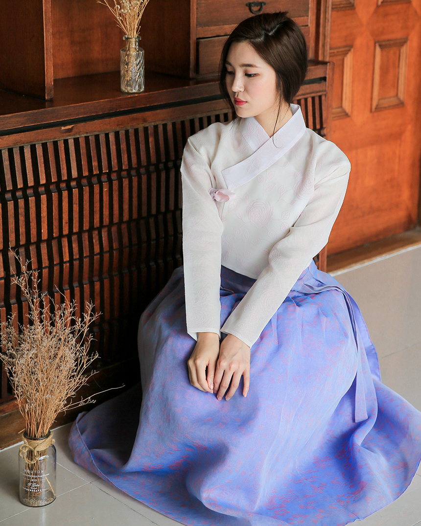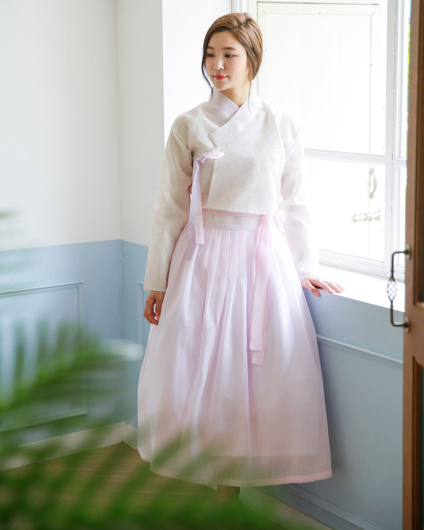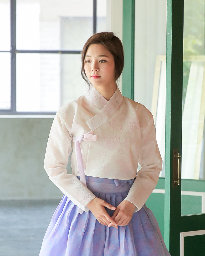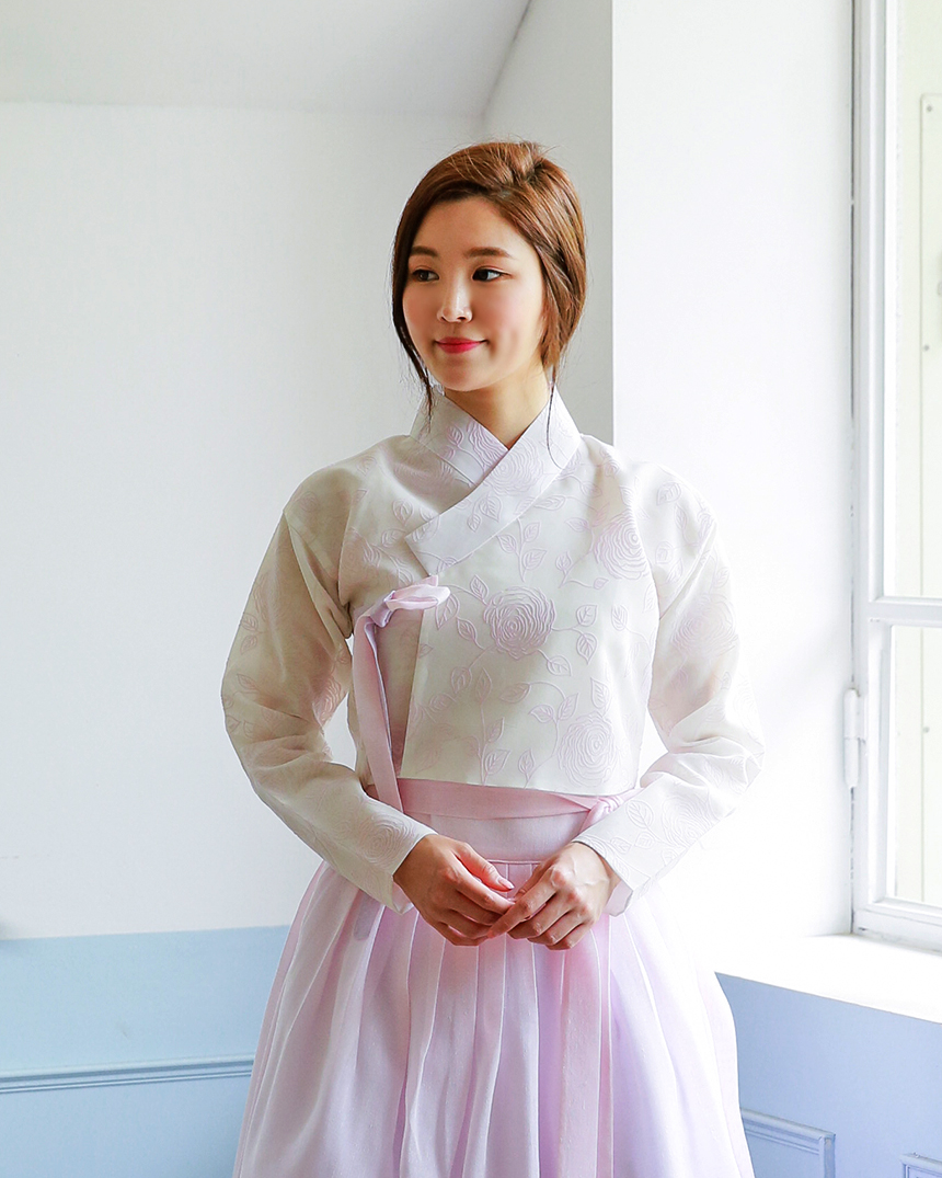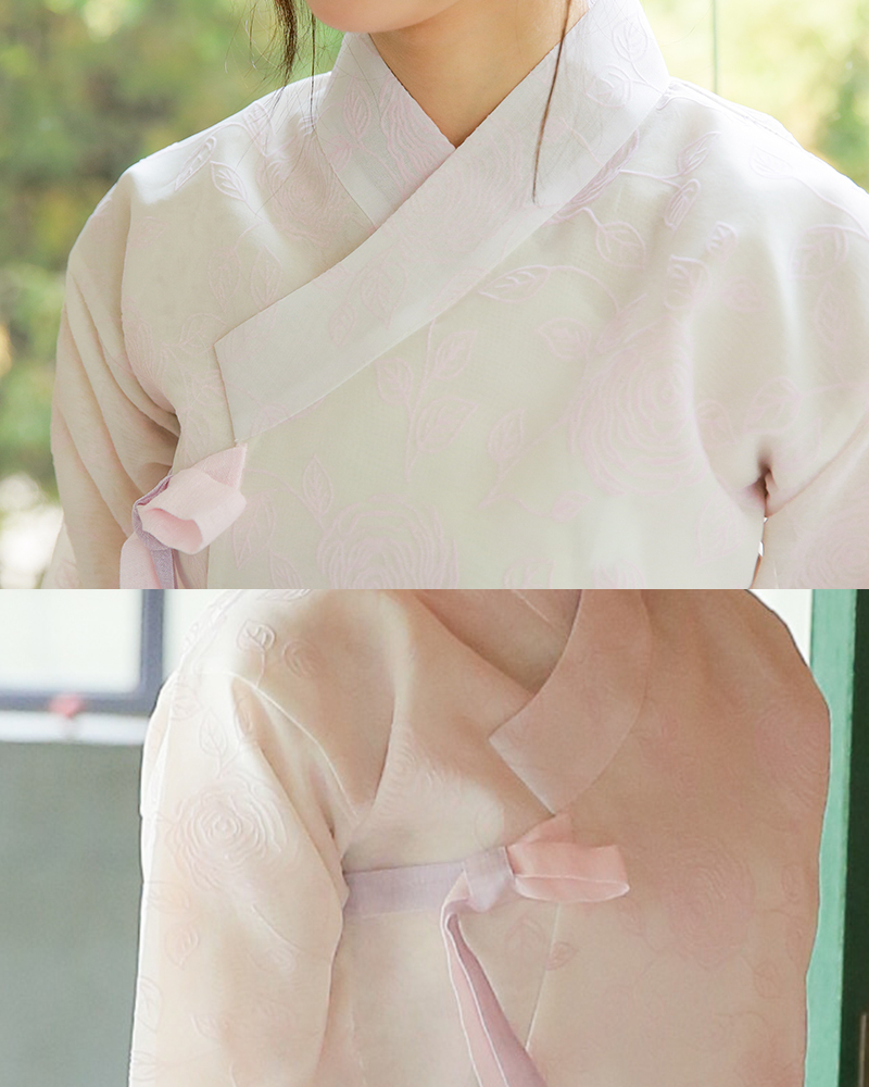 흰바탕에 파스텔분홍색 라인으로 장미무늬가 있는 고급 노방소재의 단아한 저고리입니다.