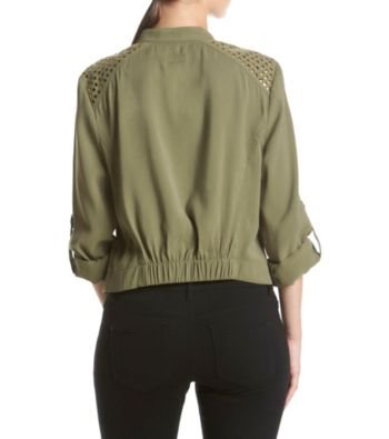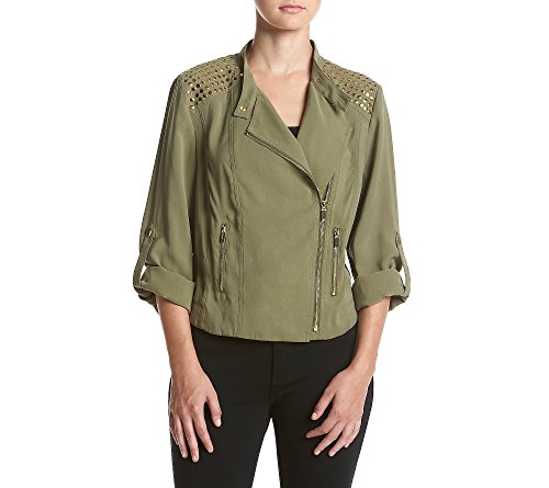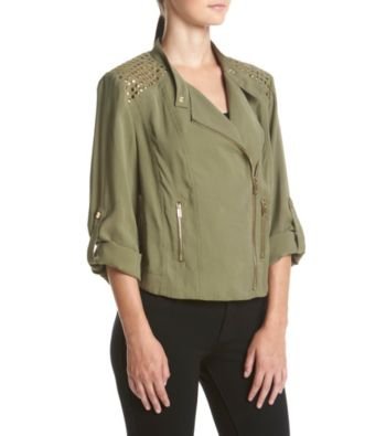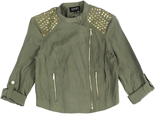 Studio : Jones New York Women's Sportswear Publisher : Jones New York Women's Sportswear Binding : Apparel Product Description Made from viscose, this moto jacket boasts gold studs on the shoulders, as well as gold zipper pockets. Super soft and lightweight, it is easy to wear and features tab sleeves. 0