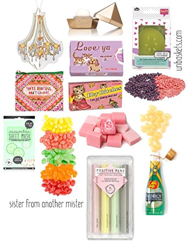-. Feature : The perfect best friend gift box! / Edible items include: hey bitches gum, prettier funnier gum, Nerds, Starbursts, Jelly Belly cocktail classics and pop rocks / Inedible items include: "great friends like you make me pee a little" wet wipes, "thanks for holding my hair back" hand sanitizer, scented colorful markers, 3-d chandelier air freshener, detox face mask, "love ya, mean it" hand soap and "you're beautiful, don't change" coin purse / All unBaskets come in our signature clear unBasket box and are ready to gift. This unBasket measures 5" X 5" X 7" / From time to time we may need to substitute an item (or a few) in one of our unBaskets. Any substitutions will be of equal or greater value and will embody the clever or unique vibe of that unBasket.