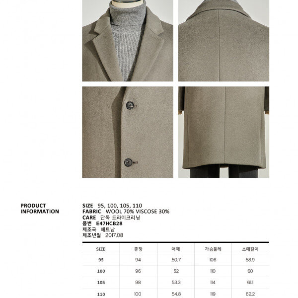 EZIO HOMME 캐시미어터치를 내는 프리미엄울인 하이브리드캐시를 사용한 기모이중지로 보온성과 드레이프성을 모두 갖춘코트입니다 베이직한 컬러감으로 정장 캐주얼에 모두 잘어울리는 코트로 사이즈는 RUO코트 보다는 조금 더 여유있게 나온 세미오버핏입니다 총장(뒷목점 기준) 94cm