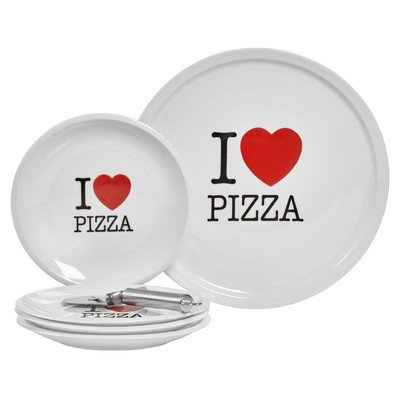 Studio : Tabletops Gallery Publisher : Tabletops Gallery Product Description Adorable 6 piece white, porcelain "I LOVE Pizza" platter set, perfect for movie nights with family and friends. Large 12" inch platter for whole pizza of your choosing, smaller 8" plates for individual use. Pizza cutter included. Plates and platter are Chip Resistant, Dishwasher Safe, and Microwave Safe. 0