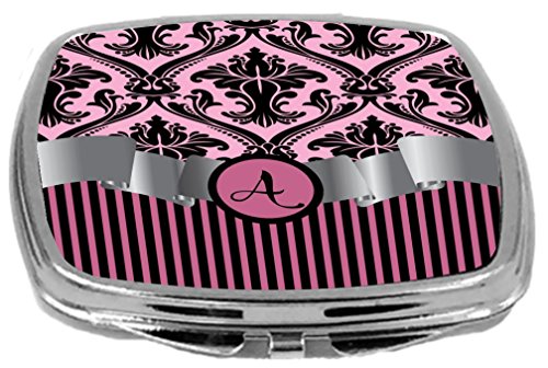 Rikki Knight Compact Mirror, Letter a Initial Light Pink Damask and Stripes