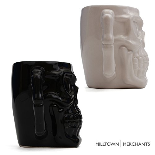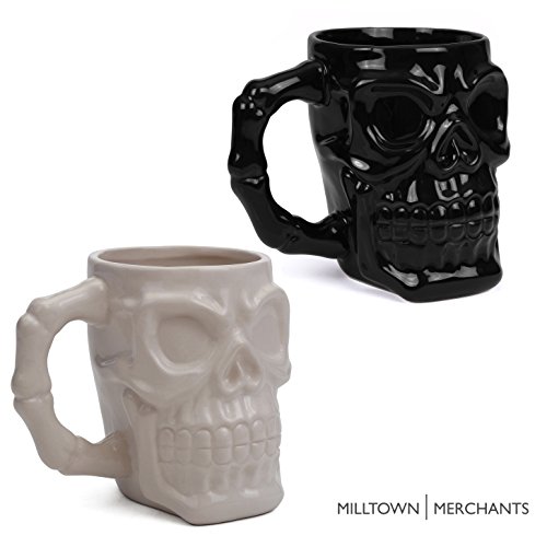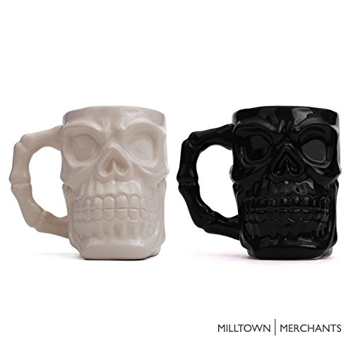 Milltown Merchants™ Black and White Skull Mug Set - Skull Beer Stein Tankard - Pack of 2 - Ceramic Skull Coffee Mugs - Gothic Beer Mugs - HUGE 32 Ounce Capacity