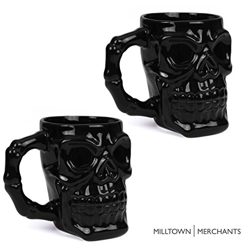 Milltown Merchants™ Black Skull Mug Set - Skull Beer Stein Tankard - Pack of 2 - Ceramic Skull Coffee Mugs - Gothic Beer Mugs - HUGE 32 Ounce Capacity