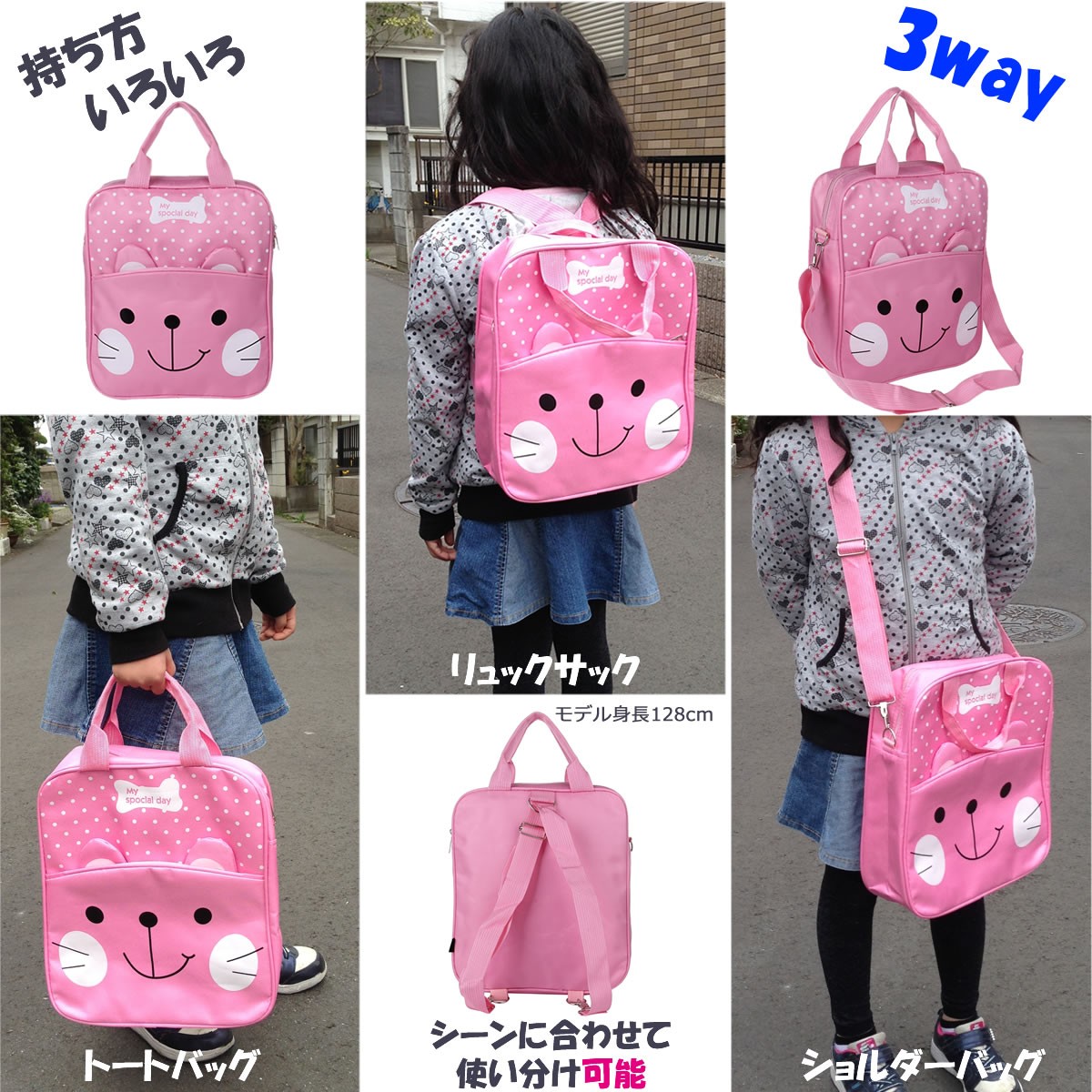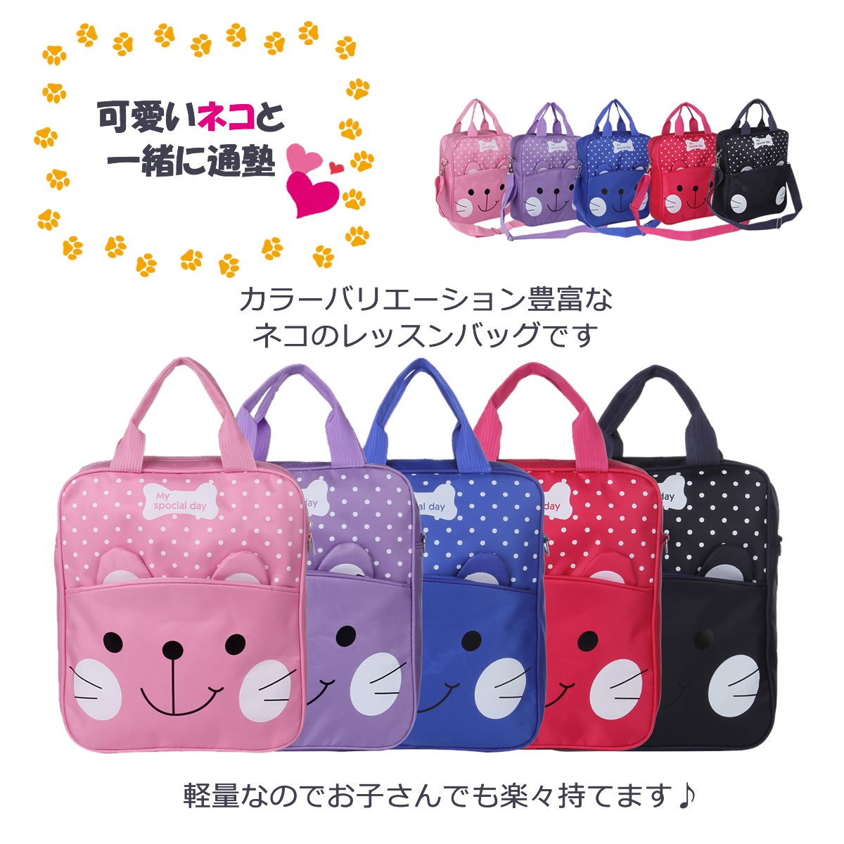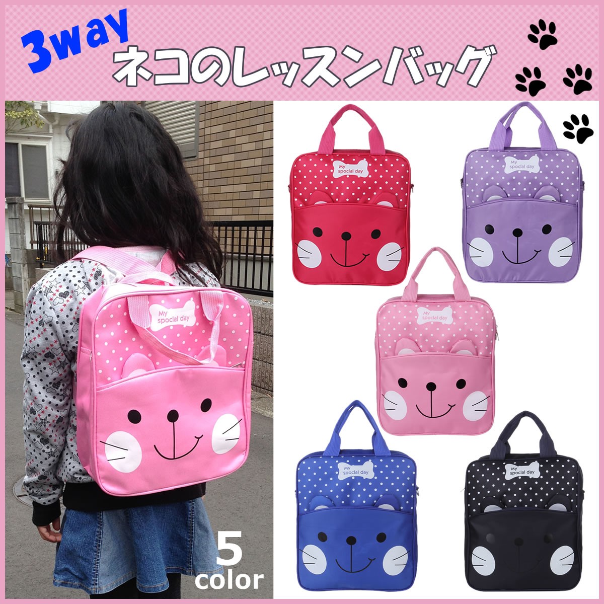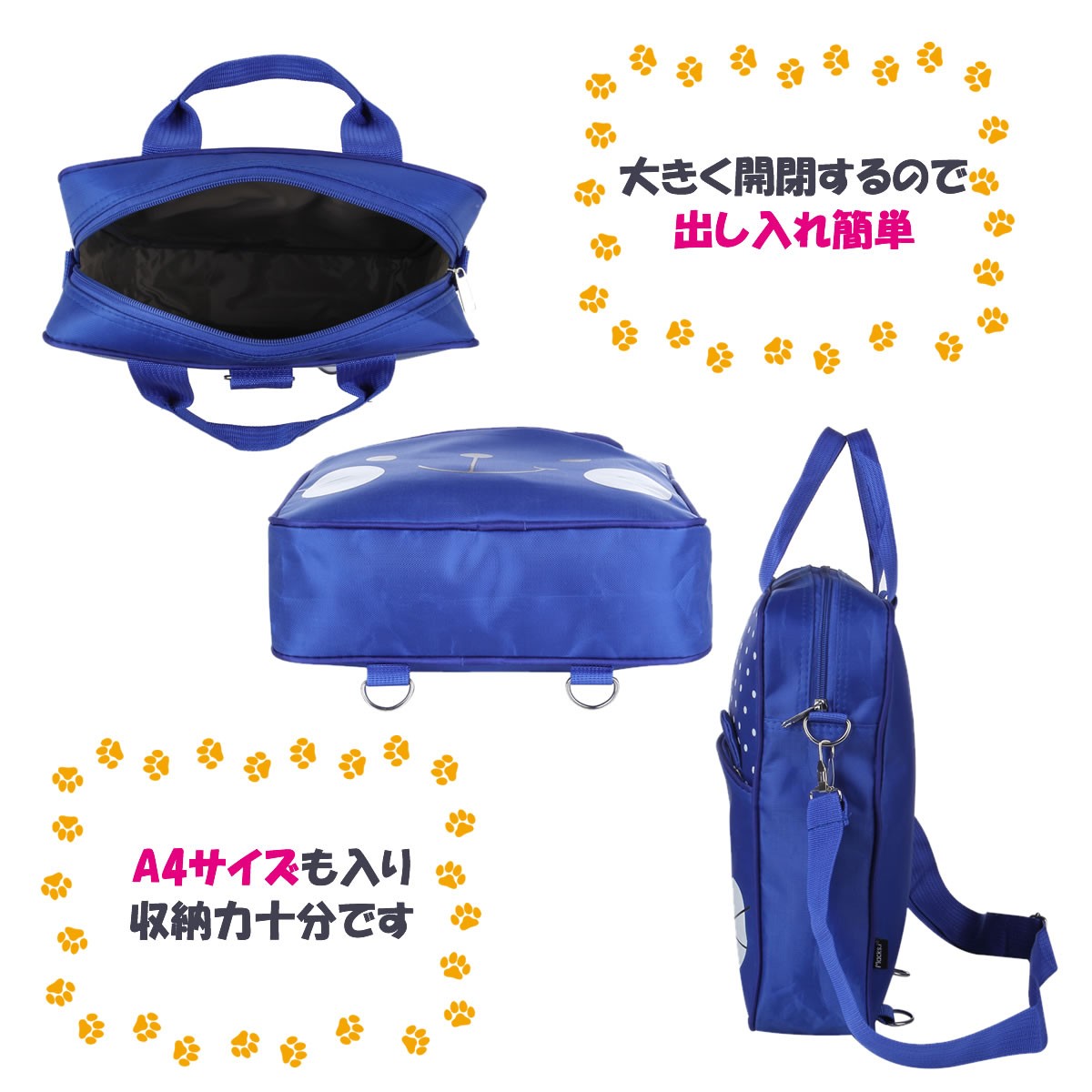ネコのレッスンバッグ子供の通塾、通園、通学を楽しくさせるカラーバリエーション豊富なレッスンバッグです♪可愛いネコの笑顔にほっこり癒されますよ持ち方いろいろ3way・リュックスタイル・ショルダースタイル・ワンハンドスタイル【サイズ】(約)縦8.5cm×横27.5cm×高さ31.5cm【重量】(約)305g【素材】ナイロン