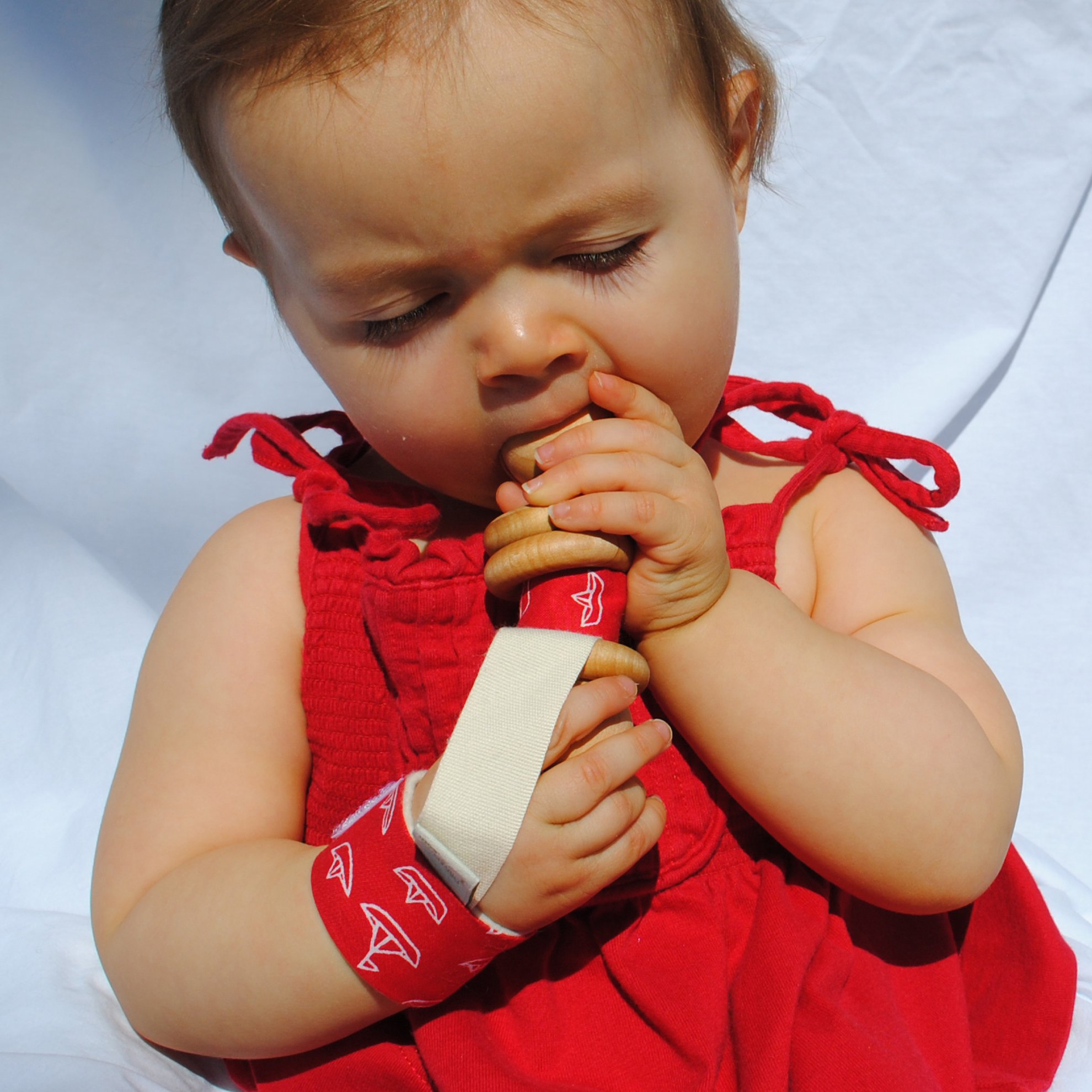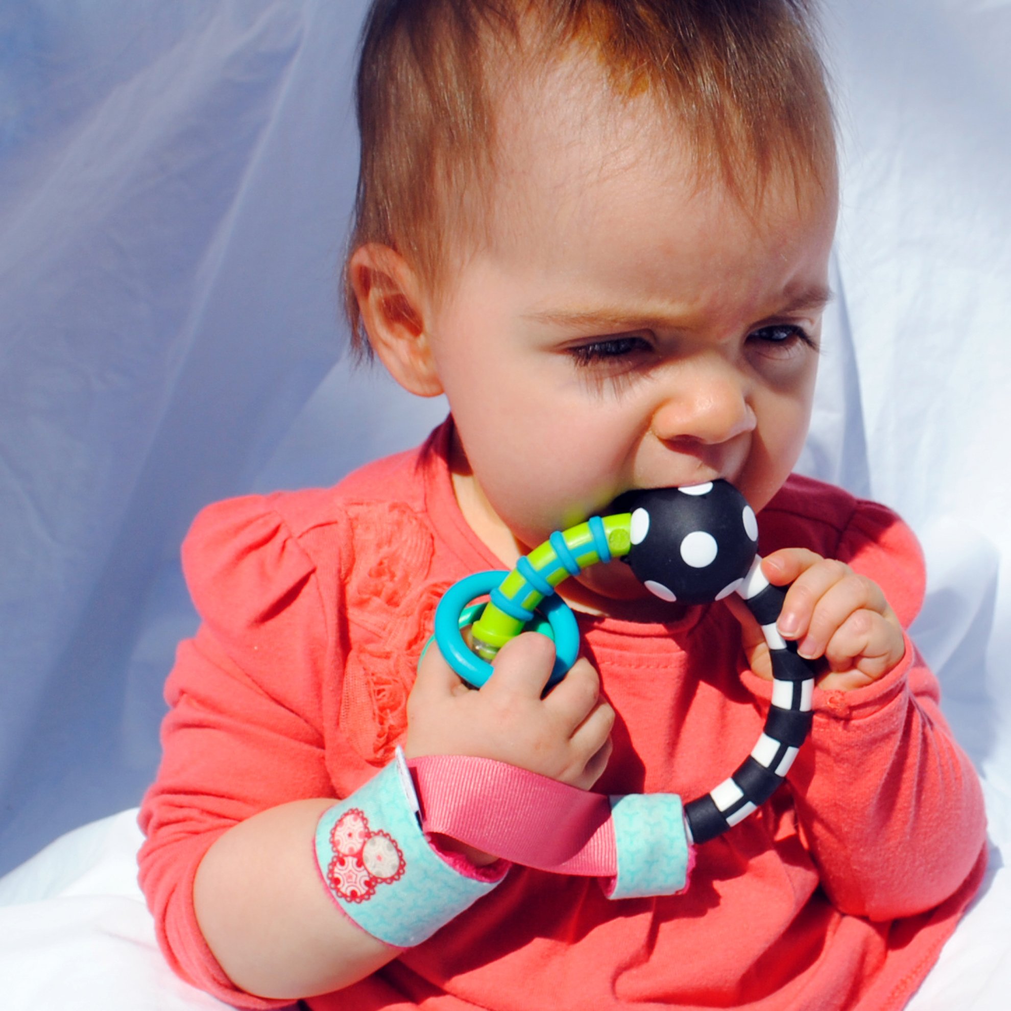 Hand holder that connects the baby's hand and rattle, Rupee Gear.