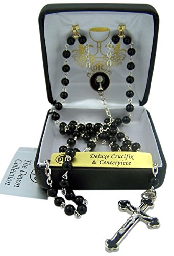 First Communion Black Prayer Bead Rosary with Enamel Chalice Centerpiece, 12 Inch