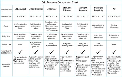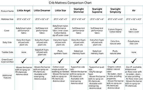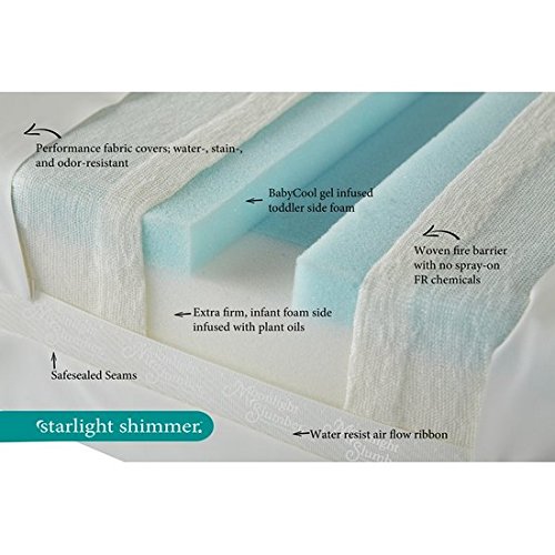 Studio : Moonlight Slumber Publisher : Moonlight Slumber Binding : Baby Product Product Description This crib mattress from Moonlight Slumber was designed to provide maximum comfort for your little one from infant to toddler. The Starlight Shimmer Crib Mattress features a two-sided design - An extra firm layer of foam infused with plant oils on the infant side, and temperature-controlling, gel-infused foam on the toddler side. It's a 6" deep, two-stage sleep system that will keep your baby comfortable for years to come. Features: Infant side: Extra firm foam infused with plant oils Toddler side: Temperature-controlling, gel-infused BabyCool foam UL GreenGuard Gold Certified Lightweight Made in the USA from sourced materials Made with welded seams and premium medical-quality water-, stain-, and odor-resistant deluxe knit fabric Fire barrier with no spray-on FR chemicals Dimensions: 52"L x 27.5"W x 6"D Care instructions: Clean with damp sponge and warm water. Use mild liquid soap if necessary. Do not use harsh cleaners or antibacterial/diaper wipes. 0