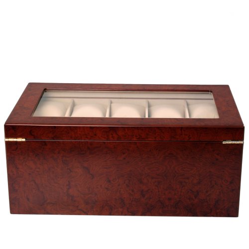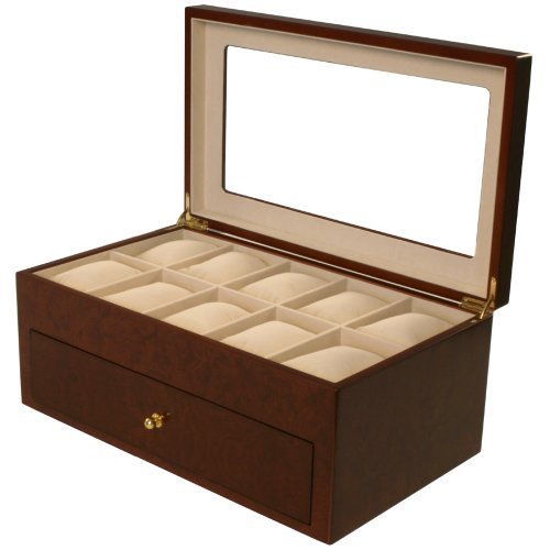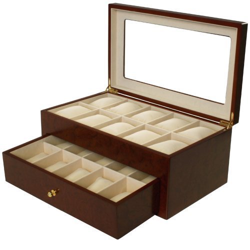Studio : Paylak Inc Publisher : Paylak Inc Binding : Watch Product Description Montego Watch Box is our newest collection of wood boxes by Tech Swiss. Showcase your timepieces in this rich matte cherry finish Montego box for 20 watches. The Montego box is a well-designed box with XL wide compartments to store large watches, soft cushions to fit both men and ladies watches and extra clearance for oversized timepieces. The meticulous made watch box comes with two levels with 10 compartments on the upper shelf and a lower drawer that pulls out for additional 10 watches. The interior is lined with a camel colored faux suede lining and each compartment comes with a soft removable cushion. The lid is inlaid with a Lucite window and is attached by two goldtone hinges. This attractive looking chest is a efficient way to store your most valuable timepieces. Watch box can be placed on a desk, night stand or dresser. Case Dimensions: 14 1/2" L x 8 1/2" W x 6" H Upper Compartment Size: 3 3/4" L x 2 1/2" W x 2 3/4H Lower Compartment Size: 3 3/4L x 2 1/4W x 2 1/4H 0