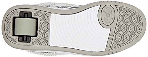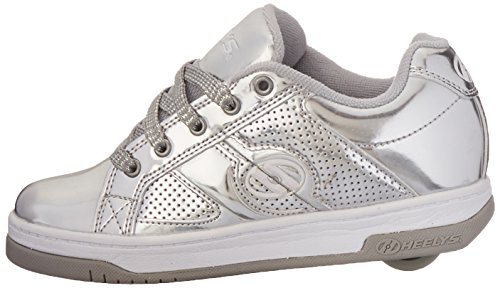 Lo-top silhouette with a wide skate body. Chrome-tinted Synthetic patent leather upper. Full lace-up closure for a snug, adjustable fit. Padded collar and tongue for added comfort and support. Heelys® logo at sides, heel, and tongue. Heelys Wave Comfort Heel Bracket provides comfort and stability. Matched molded tongue logo. Faux vulcanized cupsole with rubber outsole. Abrasion-resistant brake pad. ABEC 1 Bearings/ FATS low profile wheel.