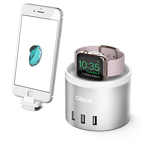 Oittm Apple Watch Series 2 Charging Stand, [Nightstand Mode] [3 in 1 Bracket Power Charger ]4-Port USB Charging Stand with Phone Holder for iPhone 7, 7 Plus, Apple Watch, Nike+ (Silver)