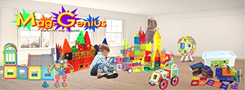 Mag-Genius series 1 more value than any other set mag-genius 123 piece set includes 2 car bases with wheels and thirteen different shapes so that kids can now stretch their imagination to the next level. More shapes means more designs and more designs means more hours of fun play. Educational fun: Mag-genius shapes and patterns provide great motor skills. Encourages imaginative and creative play and enhances math, geometry and science skills. Dr. Toy review: Mag-genius magnetic building blocks attract on all sides and the combinations form many different shapes and structures. From flat designs to squares, pyramids, plus many more unlimited geometric shapes. Tiles easily connect, which prompts kids to move from constructing two-dimensional to three-dimensional creations. Magnificent high rise 3d towers are designed by kids who have developed into critical thinkers through creative play. As they build, kids develop tools for spatial problem-solving tasks, logical thinking and math reasoning. Blocks easily connect and inspire creativity, brain development patterning, shape recognition, building and motor skills. The national parenting center review: Mag-genius are a truly remarkable open-ended building toy. Kids and parents alike were captivated and couldn't stop building an endless variety of shapes, structures, you name it. The set comes with 110 brightly colored, translucent pieces. + A plastic latch storage bin. There are triangles in three different sizes and two square sizes. Magnets are inserted inside the edges and that's about all you need to know. The magnets are strong enough to construct pretty solid structures, these pieces got a real workout but never broke or shattered. Parents noted that while the basic idea is building and playing they saw that their children were learning physics, geometry, math, spatial reasoning and architecture without even knowing it.Feature
