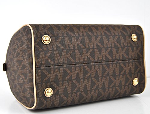 Michael Kors Grayson satchel in brown PVC. Protective feet. Flat bottom.