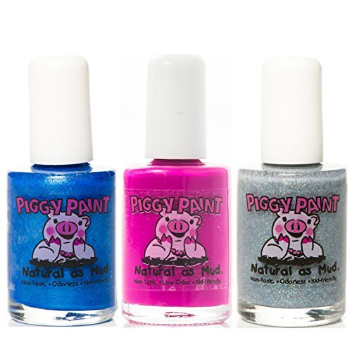 3 Polish Gift Set with the following colors Tea Party for Two, Berry Go Round, Glitterbug Non-toxic, virtually odorless, eco-friendly • Created by a Mom seeking a safer alternative for her daughters • Hypoallergenic • Made in the USA • No harsh, smelly chemicals • Quality formula dries to a hard, durable finish • For maximum chip resistance, blow dry polished nails for one minute on warm heat/ low blower setting. • Use with Piggy Paint Topcoat and Basecoat for improved performance.