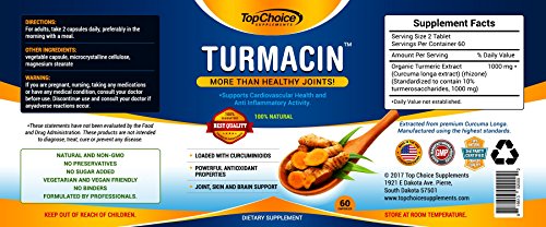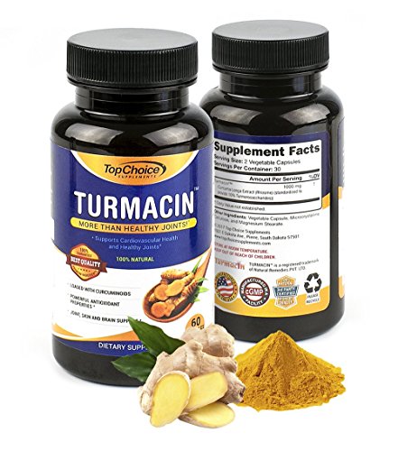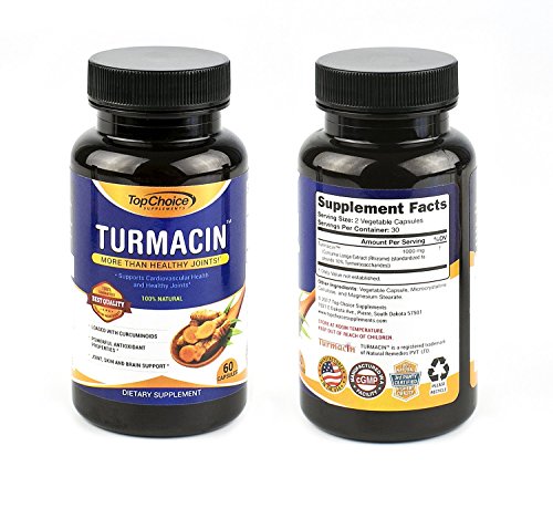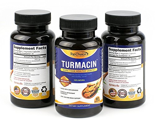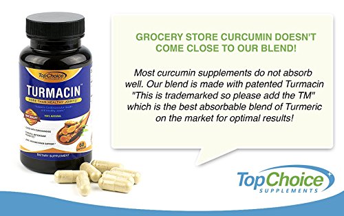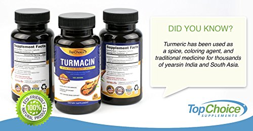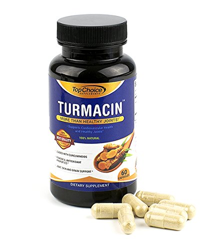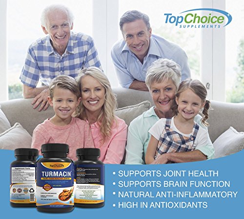 -. Feature : 100% SATISFACTION GUARANTEE: Feel healthier and stronger or your money back, no questions asked! HIGHEST POTENCY AVAILABLE TURMERIC PILLS ENHANCED WITH NEW TURMEROSACCHARIDES AND CURCUMINOIDS (THINK CURCUMINOIDS ON STEROIDS): Top Choice Supplements turmeric formula has 1000mg of Turmeric Curcumin with 2500% more absorption and bio-availability. / Features Turmacin®, clinical research sests that Turmacin helps relieve age-related pain by 42% in as little as 3 weeks! Powerful antioxidant properties, feel great quickly- Better joint support and relief quickly! Skin and brain support, feel at the top of your game in as little as 3 weeks! All Natural Formula. Potent Anti-Inflammatory & Antioxidant properties has been shown to relieve various pains and protect against free radical damage. / More than just Healthy Joints- *Supports Cardiovascular Health and Anti Inflammatory Activity. Turmeric has been used for Thousands of Years in Traditional and Ayurvedic Medicine to treat various ailments. This Wonder Spice has been passed down for Generations for its Healing Properties in the East and has been Greatly Gaining Popularity Lately in the West. Our Turmacin blend eliminates the need to use other ingredients like black pepper and BioPerine. / DOCTOR FORMULATED MADE IN USA TURMACIN TURMERIC CAPSULES: Our Turmacin Turmeric Extract is Safe | Gluten-Free | Vegan-Friendly | Free Of Preservatives | Doctor Trusted Certified | Made in US In A Certified Good Manufacturing Practices Facility that is FDA-approved following strict GMP guidelines. Our highly potent and pure Turmeric is third Party Tested to assure the highest quality and purity of each batch. Our Tumeric Turmacin blend is patented and Guaranteed to be more potent than others! / HIGHEST QUALITY INGREDIENTS: Not only is our turmeric curcumin supplement more potent, we use patented TurmacinTM for increased absorption and bioavailability. Our tumeric is pure and made raw ingredients in all our formulas. ANTI-INFLAMMATORY POWERHOUSE: Turmeric is arguably one of the most powerful herbs on the planet. Curcumin specifically, a P.R.Imary compound in turmeric powder, has been reported to be one of the most advantageous herbs. Turmeric Curcumin is an anti-inflammatory powerhouse.