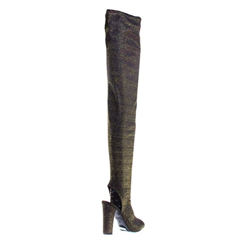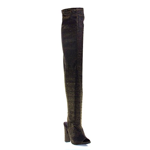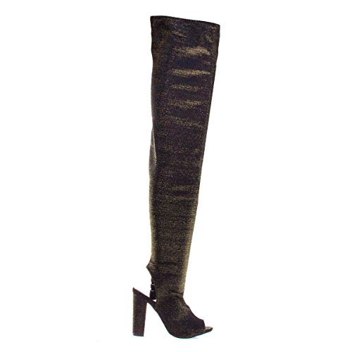 Binding : Apparel Product Description About This Shoes :Seduce with these over the knee high heel boots featuring peep toe opening, a open back heel counter, inner zipper closure, chunky block high heel, thigh high shaft and comes in faux suede and gold glittery fabric. Please measure your thigh width carefully before making the purchase. Brand - Bamboo Colors Available: Black Faux Suede, Gold Glitter Occasion: Formal Shoe Type: Tall Boots Shoe Style: Over Knee Boots Inner Lining: synthetic Heel Height In Inches - 4 Heel Style - Block Toe Style - peep-toe Platform Height In Inches - 0.25 Shaft Height In Inches - 26 Circumference Opening - 15 Strap Type - Sole - manmade All Man Made Material unless otherwise stated. Computer/Phone/Table monitors might show color differently because of its quality or calibration, we suggest you look at the photo in at least 3 monitors if you need exact color match of your shoes. 0