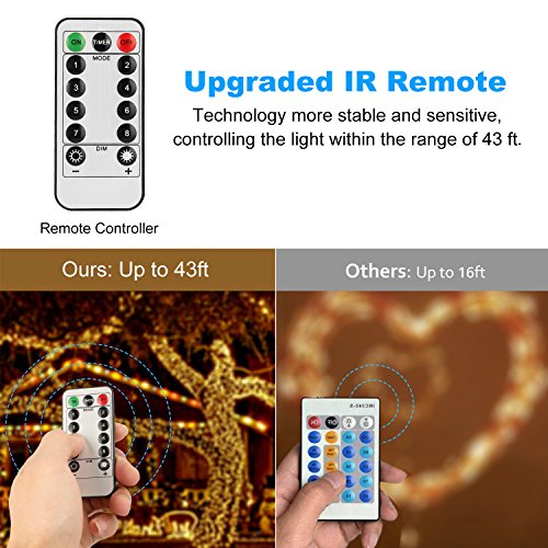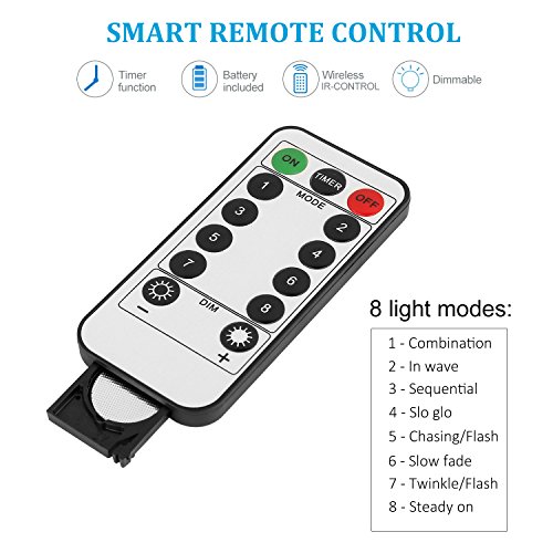 - REMOTE DESIGN: updated version with timing function, brightness adjustable, 8 light modes and latest IR remote control distance is up to 43ft create vibrant, dynamic atmospheres