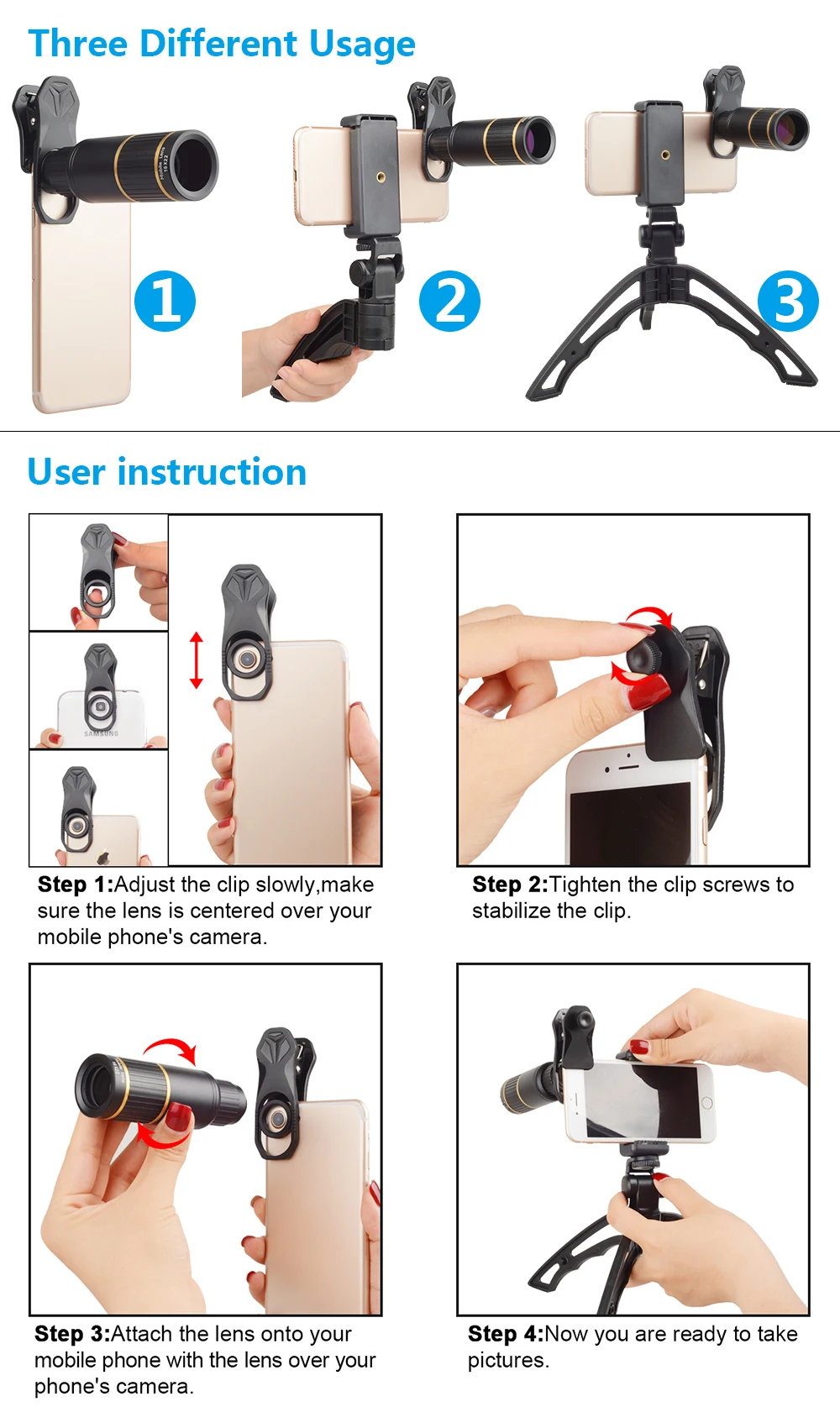 Feature 1:Mobile Telephoto Lens +Wide/macro lens+Fisheye lens