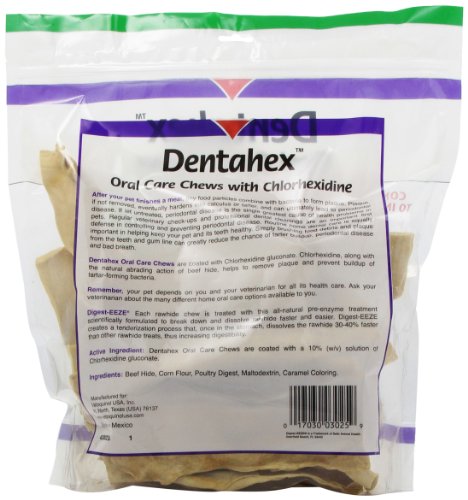 Oral care chews with Chlorhexidine to inhibit plaque buildup. 100% natural US beef hides. Processed without Formaldehyde. Made in food grade certified facilities. With Digest-EEZE for easier and faster digestibility.Feature