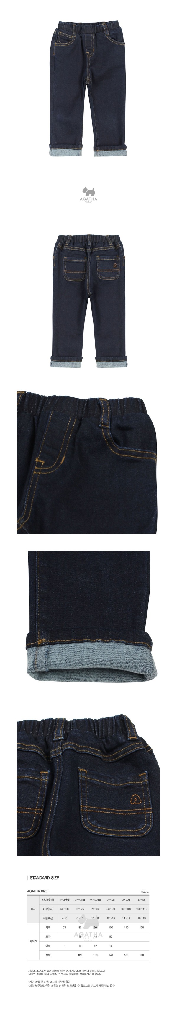 스판성 좋은 기모 소재의 베이직한 디자인의 데님 팬츠로 장식 포켓 스티치와 런닝스티치 자수로 포인트를 준 스타일입니다.