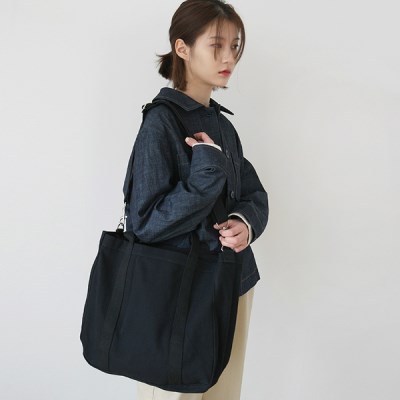 코튼 텍스쳐로 제작되어 가볍게 들기 좋으며 스트랩이 포함되어 숄더나 토트백으로 투웨이로 착용 가능합니다. 내부 공간이 나누어져 있어 수납이 더욱 편리합니다.
