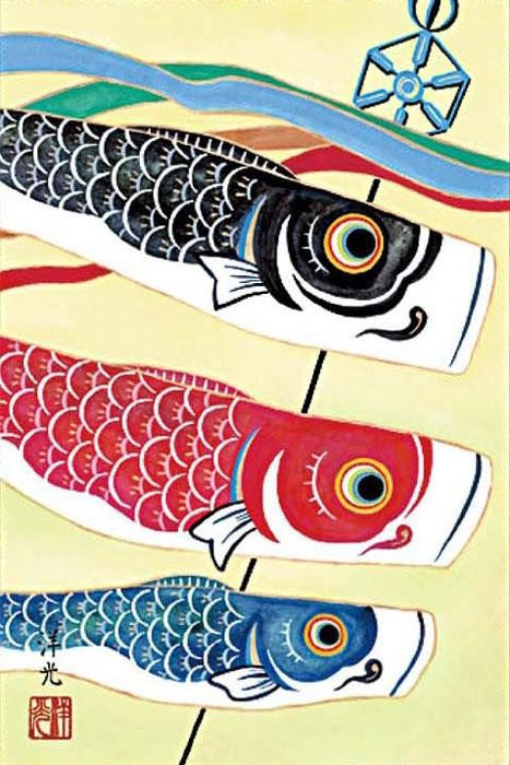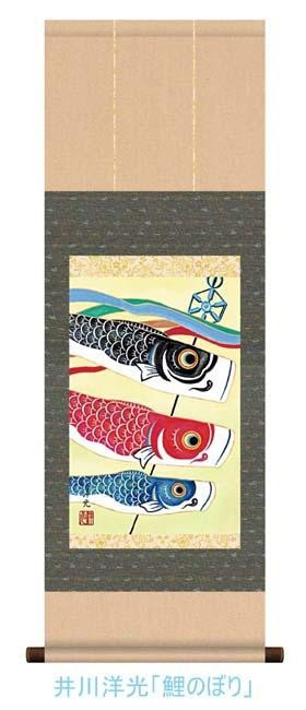 男の子の誕生と健やかな成長を祝い、将来の出世と無病息災を願う端午の節句の掛け軸です。男児の逞しい成長を祝う節句飾りに最適な題材を、可愛らしく、かつ大胆に描き上げました。 |