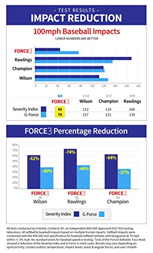 This Hockey Style version of the FORCE3 Mask will protect you a LOT better. *With the same footprint of a traditional hockey style mask, FORCE3's breakthrough, Patent-Pending technology reduces the Severity Index of most impacts by up to 50% in most cases. G-Forces were also reduced with impressive results. Tests included impacts by 70mph softballs (NOCSAE standard), and 100mph baseballs.