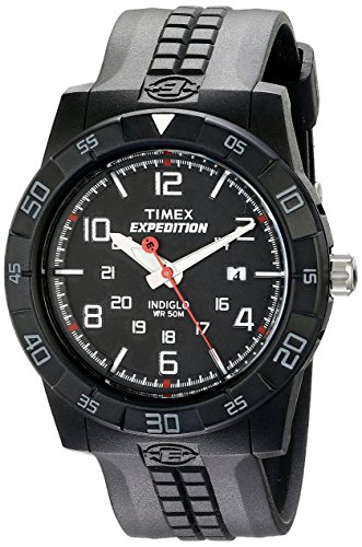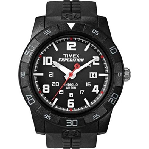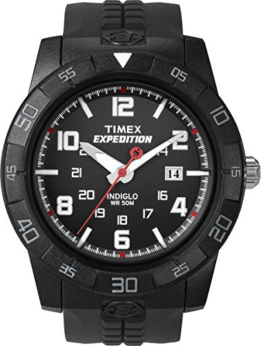 Amazon.com Product Description A strong, bold look for an active man, the Timex Men's Expedition Rugged Analog Watch features a round, black dial with white, Arabic numeral indexes at even hours, 24-hour function indexes, luminous hands, and a date display at the three o'clock position. Even low-light conditions, the watch is easy to ready with its Indiglo night-light. A durable, black resin bezel and case surround the dial while a mineral crystal window protects from scratches and nicks. The strong watch band is also made from black resin and offers a buckle clasp that makes it easy to put on and take off. It's equipped with reliable quartz movement and is water-resistant to 165 feet (50 meters).