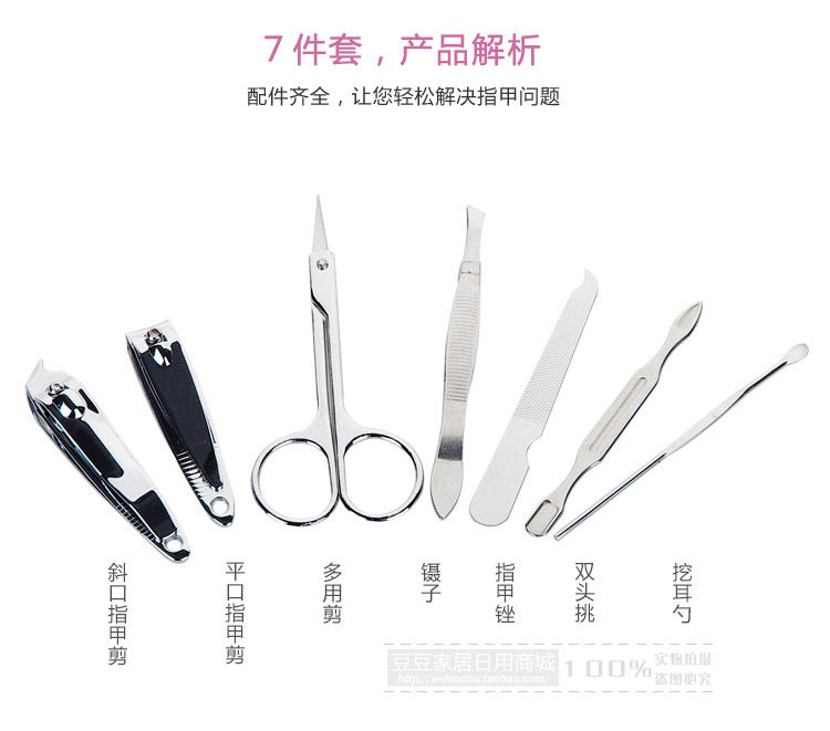 High-quality stainless steel, durable, nail, eyebrow, beauty and other easy to get, to facilitate your life. Box: flat nail clippers, oblique nail clippers, dig ear spoon, tweezers, nail file,