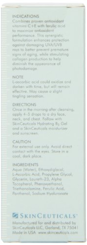 -. Binding : Health and Beauty -. Brand : SkinCeuticals -. Color : Yellow -. Department : unisex -. EAN : 0635494263008 -. Feature : Combines proven antioxidant vitamins C & E with Ferulic Acid to maximize antioxidant performance / Protects against damaging UVA/UVB rays / Prevent premature signs of aging while stimulating collagen production to help diminish the appearance of photo damage / Once absorbed, can't be washed or rubbed off - excellent for use in conjunction with suncreens / Made in USA -. IsAdultProduct : 0 -. IsAutographed : 0 -. IsMemorabilia : 0 -. Label : SkinCeuticals -. LegalDisclaimer : For external use only. Avoid direct contact with the eyes. Store in a cool, dark place.Read and follow directions on packaging. -. Manufacturer : SkinCeuticals -. Model : S1107900 -. MPN : 1.0 oz -. NumberOfItems : 1 -. PackageQuantity : 1 -. PartNumber : 1.0 oz -. ProductGroup : Beauty -. ProductTypeName : BEAUTY -. Publisher : SkinCeuticals -. ReleaseDate : 2008-07-11 -. Size : 1 fl oz -. Studio : SkinCeuticals -. Title : Skinceuticals CE Ferulic, 1-Ounce Bottle -. UPC : 635494363203