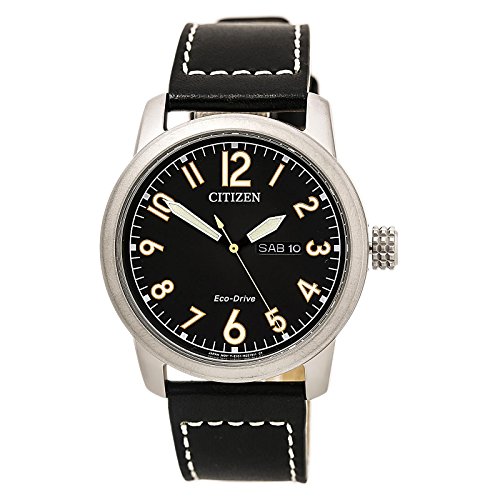 Citizen Eco-Drive™ FAQ Watch Sizing Guide This military-inspired Citizen® watch will keep your look ruggedly handsome! Stainless steel case. Leather strap with adjustable buckle closure. Round face. Three-hand analog display with quartz movement. Black dial features silver-tone hands, luminous hour markers, date display window, minute track, and Citizen detailing. Water resistant 100 meters. Display case included. Imported. Citizen Watch offers a five-year limited manufacturer's warranty on all their products. For more information, please visit their website and see the "Service Information" section. Measurements: Case Height: 42 mm Case Width: 42 mm Case Depth: 10 1⁄2 mm Band Width: 11⁄13 in Band Circumference/Length: 9 in Weight: 2.4 oz This product may have a manufacturer's warranty. Please visit the manufacturer's website or contact us at warranty@support.zappos.com for full manufacturer warranty details.Feature