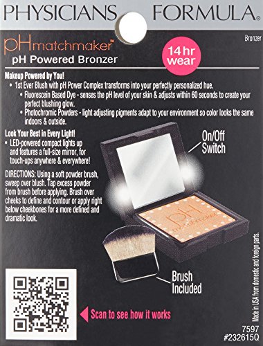 ReleaseDate : 2014-09-01 Studio : Physicians Formula Publisher : Physicians Formula Binding : Health and Beauty Product Description Makeup Powered by You 1st Ever Bronzer with pH Power Complex transforms into your perfectly personalized hue. Fluorescein Based Dye-senses the pH level of your skin and adjusts within 60 seconds to create your perfect bronze glow. Photochronic Powders-light adjusting pigments adapt to your environment so color looks the same indoors and outside. 0
