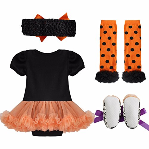 -. Brand : Freebily -. Department : baby-girls -. Feature : Short sleeves romper with different patterns in the front / Ruffle trimmings and bowknot around the waist / Snap closures at bottom for easy diaper changing / Matching leg warmers with polka dots pattern accented with ruffles / Suitable for Halloween, birthday party, photos, holiday or daily wear. -. ProductGroup : Apparel -. ProductTypeName : BABY_COSTUME -. Title : Freebily Baby Girls First Halloween Outfits Costume Tutu Romper with Headband Leg Warmer Shoes