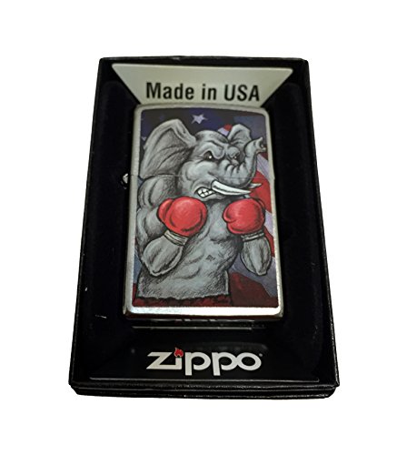 -. Binding : Health and Beauty -. Brand : Zippo -. Feature : Lifetime Warranty by Zippo - They will fix this for free! / Limited Edition - Don't be caught with the same lighter as someone else! / Made in America - You are supporting American Workers! / Original Windproof Lighter - Always have a flame on most windy days. / Refillable - No more disposables! -. IsAdultProduct : 0 -. Label : Zippo -. Manufacturer : Zippo -. PackageQuantity : 1 -. ProductGroup : Health and Beauty -. ProductTypeName : HEALTH_PERSONAL_CARE -. Publisher : Zippo -. Studio : Zippo -. Title : Zippo Custom Lighter - Republican Symbol Elephant Boxing - Regular Brush Finish Chrome