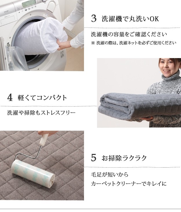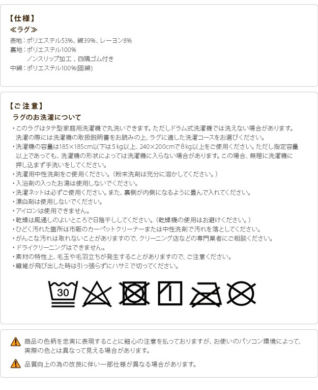 ※メーカー直送のため代金引換はお受けできません。※沖縄・一部離島は別途送料がかかります。お見積もりいたしますのでお問い合わせ下さい。【カラーバリエーション】ブラウン・グレー【仕様】表地:ポリエステル53%、綿39%、レーヨン8%裏地:ポリエステル100%(不織布)中綿:ポリエステル100%(固綿)裏面:ノンスリップ加工、四隅ゴム付き【サイズ】幅240x奥行200cm重量:約3kg株式会社ナカムラ(21101840)