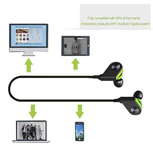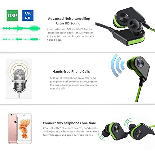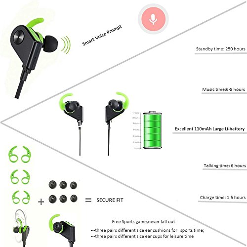 -. Feature : High-Fidelity Sound: Enjoy crisp, rich music with APTX lossless sound and Bluetooth 4.1 technologies. CVC 6.0 noise cancellation almost eliminates background noise to ensure high-quality audio when making calls / Incredible Playtime: Built-in excellent 110mAh Li-battery ensure the headphone 8-hour playtime on a 1.5-hour charge, allowing you to enjoy music on-the-go all week. (playtime varies according to volume level and audio content) / Secure Fit: Included S/M/L eartips and in-ear earhooks to lock the Bluetooth earbuds in ear firmly and will not fall out of ear when make sports like running,jogging or even dancing. Comfortable, tangle-free neckband design / Smart Magnetic Control: When the 2 earbuds are taken apart, the Bluetooth headset will be powered on and enter into paring status, and if the 2 earbuds are together, the headset is in power off status. Say goodbye to complex physical button functional key / Easy to Use: The Bluetooth headphone are compatible with iPhone, iPad, Samsung Galaxy, android smartphones, tablets, windows devices & other devices. Microphone & phone control---Touch of the earbuds button lets you manage volume, pause, forward/back & answer calls easily