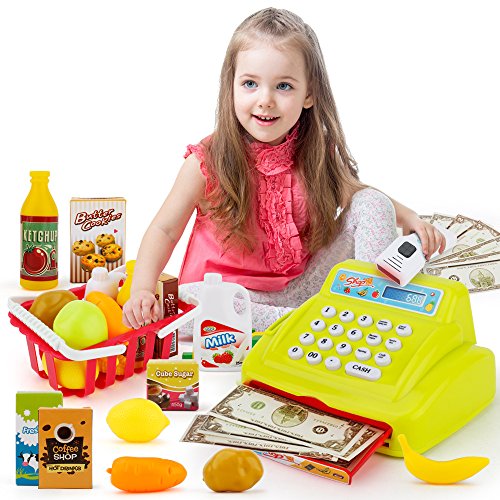 26 PCS Cash Register Set:1 PCS cash register ,1 PCS Scanner,13 PCS Grocery Toys,10PCS Cash,1 PCS Credit card.