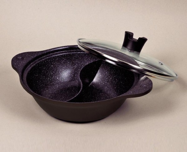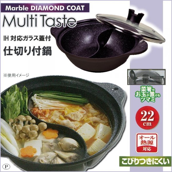 | 仕切り付きで二つの味が同時に楽しめます。辛口好きの方も苦手な方も一緒に楽しめるので、お子様のいるご家庭でも大活躍。耐久性に優れキズに強い、マーブルダイヤモンドコートが施されています。 |
