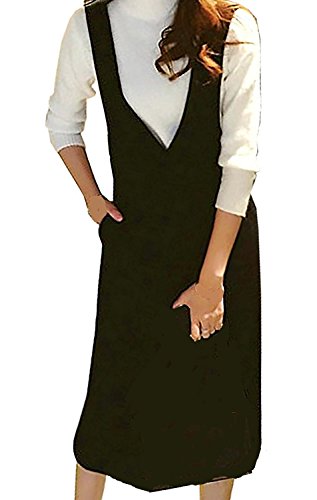 -. Feature : 深いVネックと無地のブラックが、きれいめで大人っぽい印象を与える ジャンバースカートです。 / タイトなサロペットスカート のウエスト切り替えデザインが上品で優雅です。前裾中央部にスリットがありますが、それほど露出感、セクシー感もなく足さばき良く動きやすいです。着やせするデザインで体型カバーができて、細見え 脚長な印象に。さらりとした肌触りの良い素材は、体型の気になる部分をふわっとカバーしてくれます。 / 【Mサイズ】スカート丈:105cm ウエスト:74cm ヒップ:90cm 【Lサイズ】スカート丈:107cm ウエスト:77cm ヒップ:96cm 【XLサイズ】スカート丈:109cm ウエスト:80cm ヒップ:102cm 【XXLサイズ】スカート丈:110cm ウエスト:84cm ヒップ:104cm  海外製品で小さめの作りとなっておりますので、一つ上の大きいサイズでの購入をお勧め致します。 / 生地はポリエステル。ポリエステル生地は圧倒的な耐久性・シワになりにくい・吸湿性が低くすぐに乾く・高い温度にも耐えられ、お洗濯もしやすい…などメリットがとっても多いです。それでいて生地感はカジュアル過ぎず、結婚式や二次会などのフォーマルなパーティーやお呼ばれのドレスとしてもお使いいただけ、場所を選ばないで着ることができる重宝なアイテムです。 / シンプルデザインで、着回し自在なニットのふだん着として、デイリーにもオフィスカジュアルにも活躍できます。またミモレ丈のマタニティウェアとしてもお使いいただけます。裏地はありませんが、ほどよく重みと厚みのある生地で透けませんし、シルエットもきれいです。通気性も良いので、これからの寒い季節に活躍するアイテムです。ルーズフィットなバランスで つかず離れずのふんわり感があり、インナーにシャツやニットを着ても余裕で、相性ばっちりです。