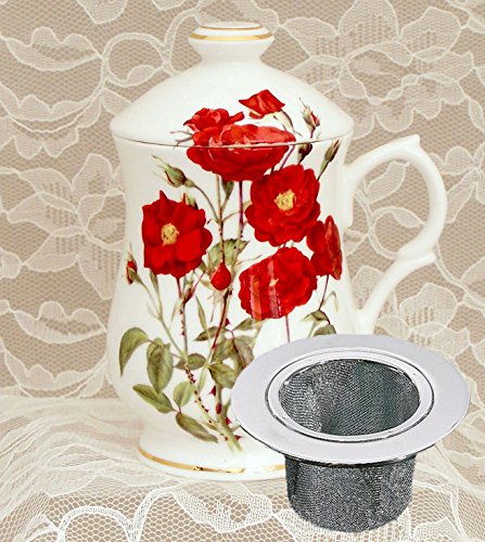 -. Brand : Imperial Porcelain Teaware -. Color : red, white, and green -. EAN : 0602401776326 -. Feature : Fine English Bone China "Romantic Rose" Lidded mug / Beautiful Rose design11 oz capacity / Trimmed in gold, not for microwave / Flat stainless steel infuser ring included / Great gift for any tea lover! -. Label : IMPERIAL PORCELAIN TEAWARE -. Manufacturer : IMPERIAL PORCELAIN TEAWARE -. ProductGroup : Kitchen -. ProductTypeName : KITCHEN -. Publisher : IMPERIAL PORCELAIN TEAWARE -. Studio : IMPERIAL PORCELAIN TEAWARE -. Title : Fine English Bone China Mug with Lid and Infuser - Romantic Rose -. UPC : 602401776326