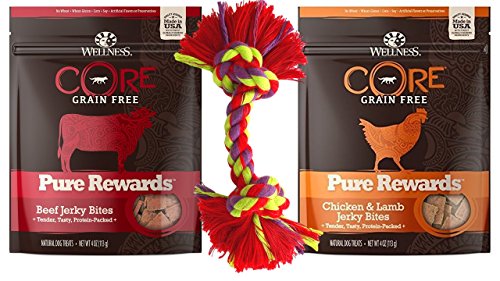 -. Title : Wellness CORE Grain Free Pure Rewards 2 Flavor Variety with Toy Bundle: (1) Beef Jerkey Bites, (1) Chicken & Lamb Jerky Bites, 4 Oz. Ea.