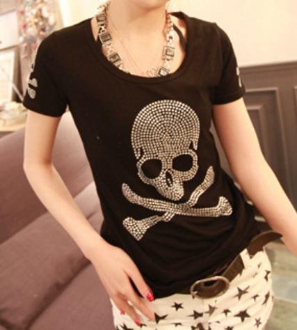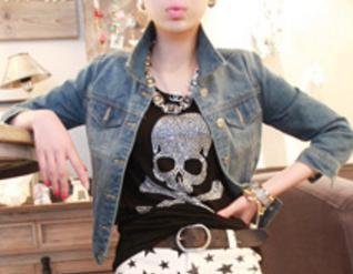 -. Feature : オシャレなレディーススカルTシャツです。 / サイズはMとLからお選びいただけます。 / Mサイズ:胸囲約87cm、衣長約60cm、肩幅約38cm、袖長約19cm / Lサイズ:胸囲約89cm、衣長約62cm、肩幅約40cm、袖長約62cm / ドクロマークは、ホットスタンプ転写です。