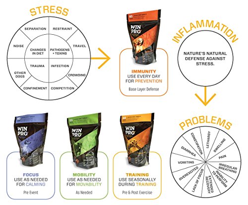 WINPRO® is a performance supplement, not a nutritional supplement. And while nutrition and proper diet are important, they alone can't combat the health-robbing effects of stress and inflammation. While nutrition = food and helps fuel the animal, it passes rather quickly through the gut and there is no "residual effect" for the body to utilize. Unlike traditional supplements, the animal blood proteins used in WINPRO K-THRIVE FORMULA D (our proprietary blend) act much differently in the dog. Unique amino acid chains (proteins) in WINPRO bind in the gut of the dog. So when stress creates an inflammatory response, the proteins are released to help alleviate the condition. That's the WINPRO difference. And WINPRO works fast. While most traditional supplements promise results in 30-60 days, you will see WINPRO work in as little as two days. And for a dog owner, seeing is believing. Contains 60 chews, 30 day supply.Feature