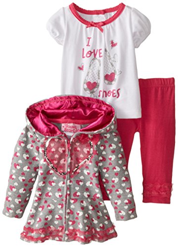 -. Binding : Apparel -. Brand : Young Hearts -. Department : baby-girls -. Feature : Screen-print on pullover / Glitter tulle applique on jacket / Tacked on bow with rhinestone button on pullover -. Label : Young Hearts Baby -. Manufacturer : Young Hearts Baby -. PackageQuantity : 1 -. ProductGroup : Apparel -. ProductTypeName : SHIRT -. Publisher : Young Hearts Baby -. Studio : Young Hearts Baby -. Title : Young Hearts Baby-Girls Newborn 3 Piece Heart French Terry Jacket Set
